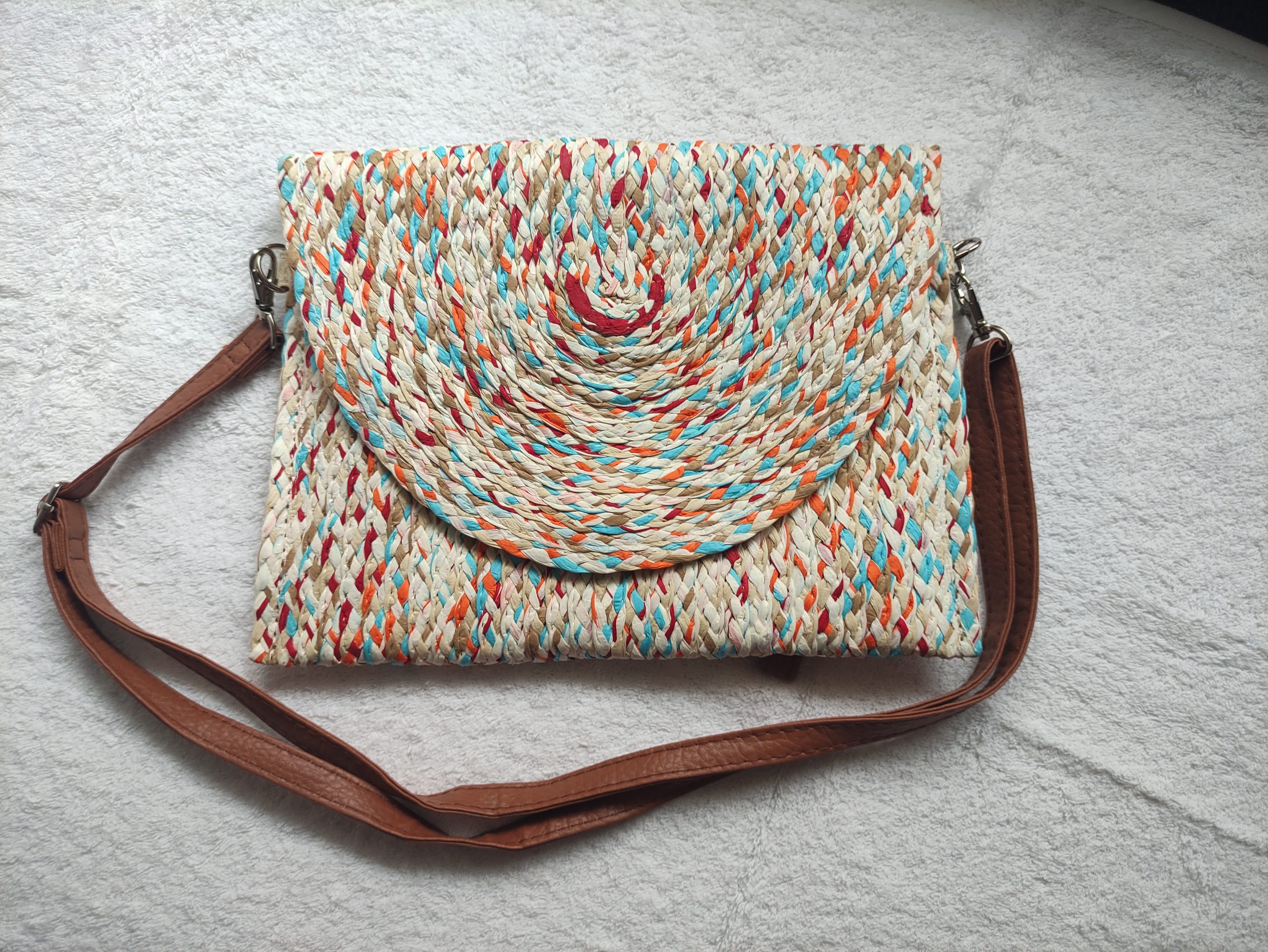 Bolso bandolera de mimbre de tamaño medio multicolor con asa marrón.
